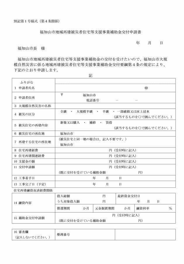 第11条 補助金の交付申請の取下げは、福知山市地域再建被災者住宅等支援事業補助金交付申請取下書(別記第6号様式)により行うものとする。