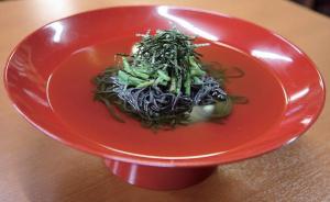 食堂大江山で提供される赤い盃に黒いそばの「鬼そば」は大江山の名物。しっかりとした喉ごしと山菜たっぷりのそばが特徴的です。赤い盃を持つ様は、まるで「最強の鬼」酒吞童子のよう。