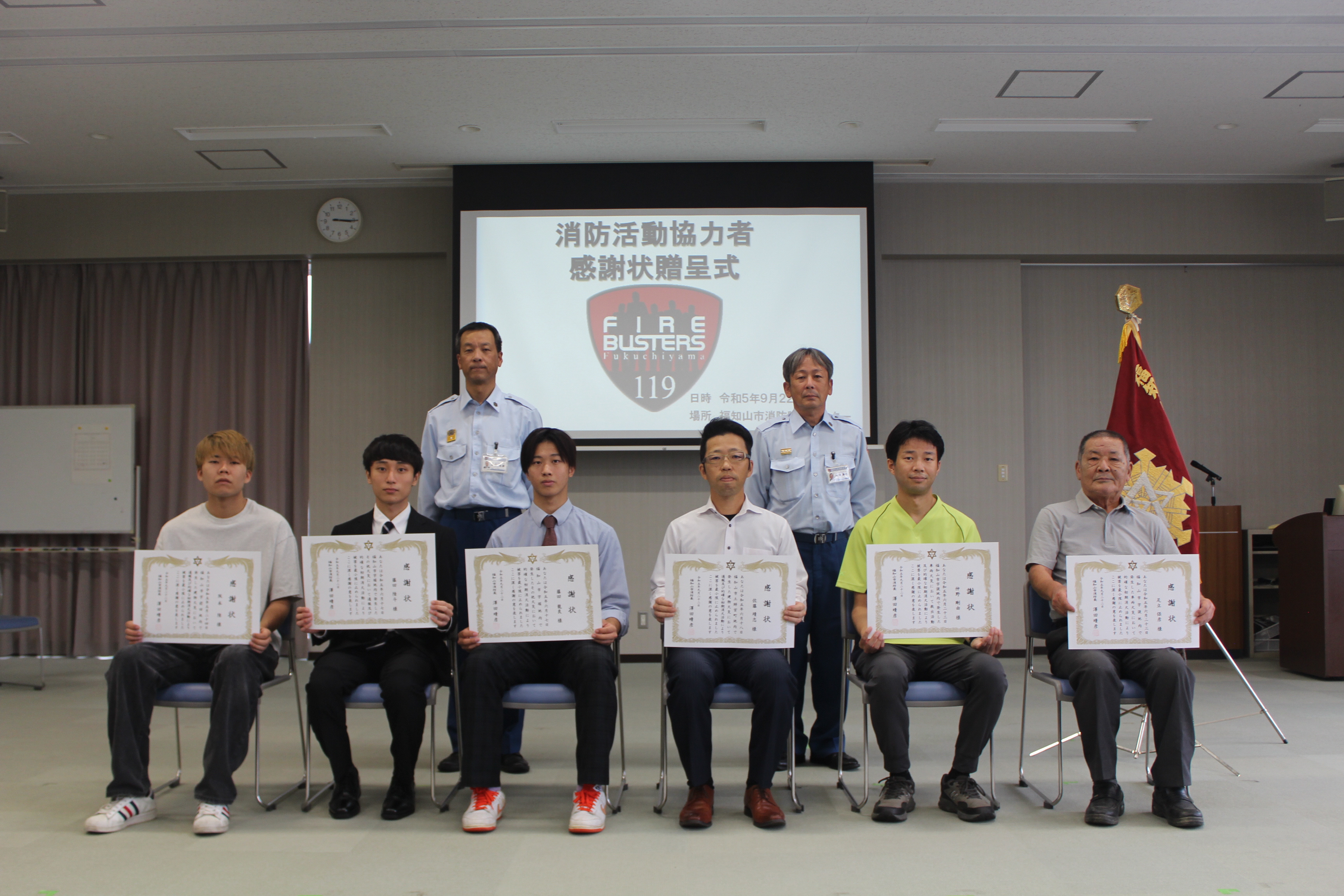 令和5年5月6月に市内で発生した4件の火災において、適切な通報や初期消火活動などを実施いただいた6名の方に福知山市消防長(澤田晴彦)から感謝状の贈呈を行いました。