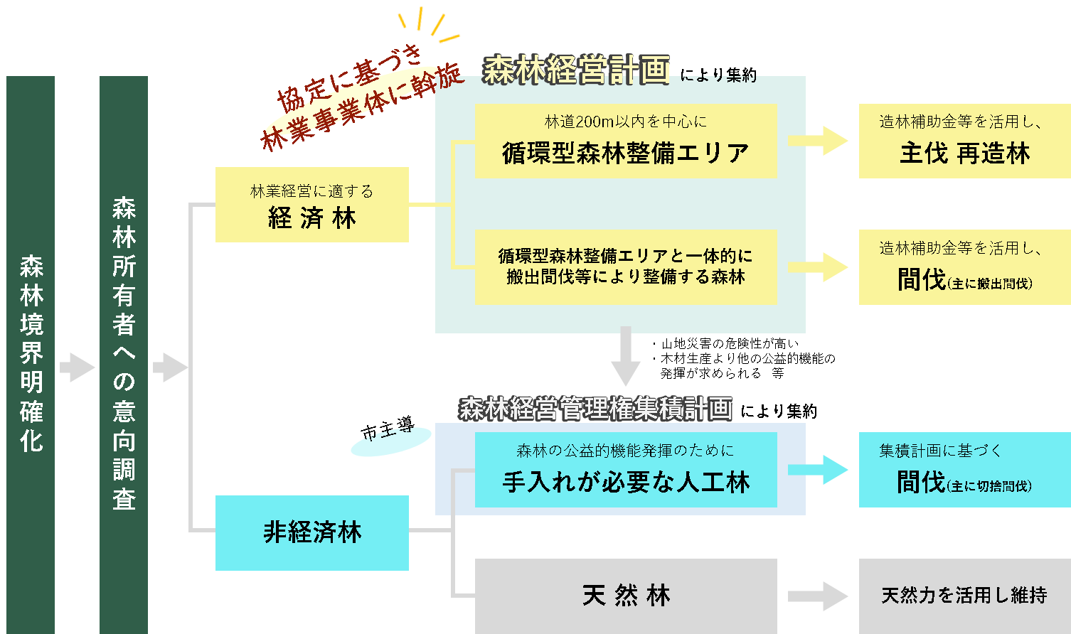 本市では、上記の『森林経営管理制度』の枠組みの中で、特に効率的に森林整備が可能なエリアを中心に、循環型森林整備を進めます。