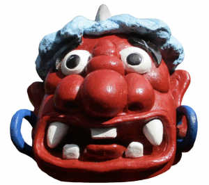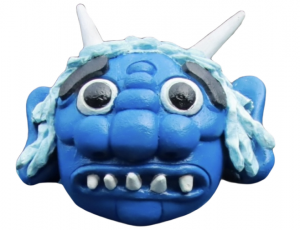 鬼像の中で、雨の日に1番多くカエルがついています。口の中にカエルが入っても、食べずに雨宿りさせている優しい鬼です。