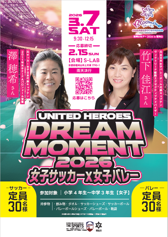 福知山市で子どもたちが多種多様なトップアスリートや競技と触れ合える機会を創出し、夢を持つきっかけづくりとなるイベントとして2023年度から開始した「THE SPORTS/UNITED HEROES」。今回は国際女性デーに合わせて、女子プレーヤーに向けてスポーツの愉しさや特有の問題に対する前向きな環境づくりへのメッセージとして、福知山ユナイテッドが進める – Bloomine(女子プレーヤー応援プロジェクト)-の特別編として開催いたします。